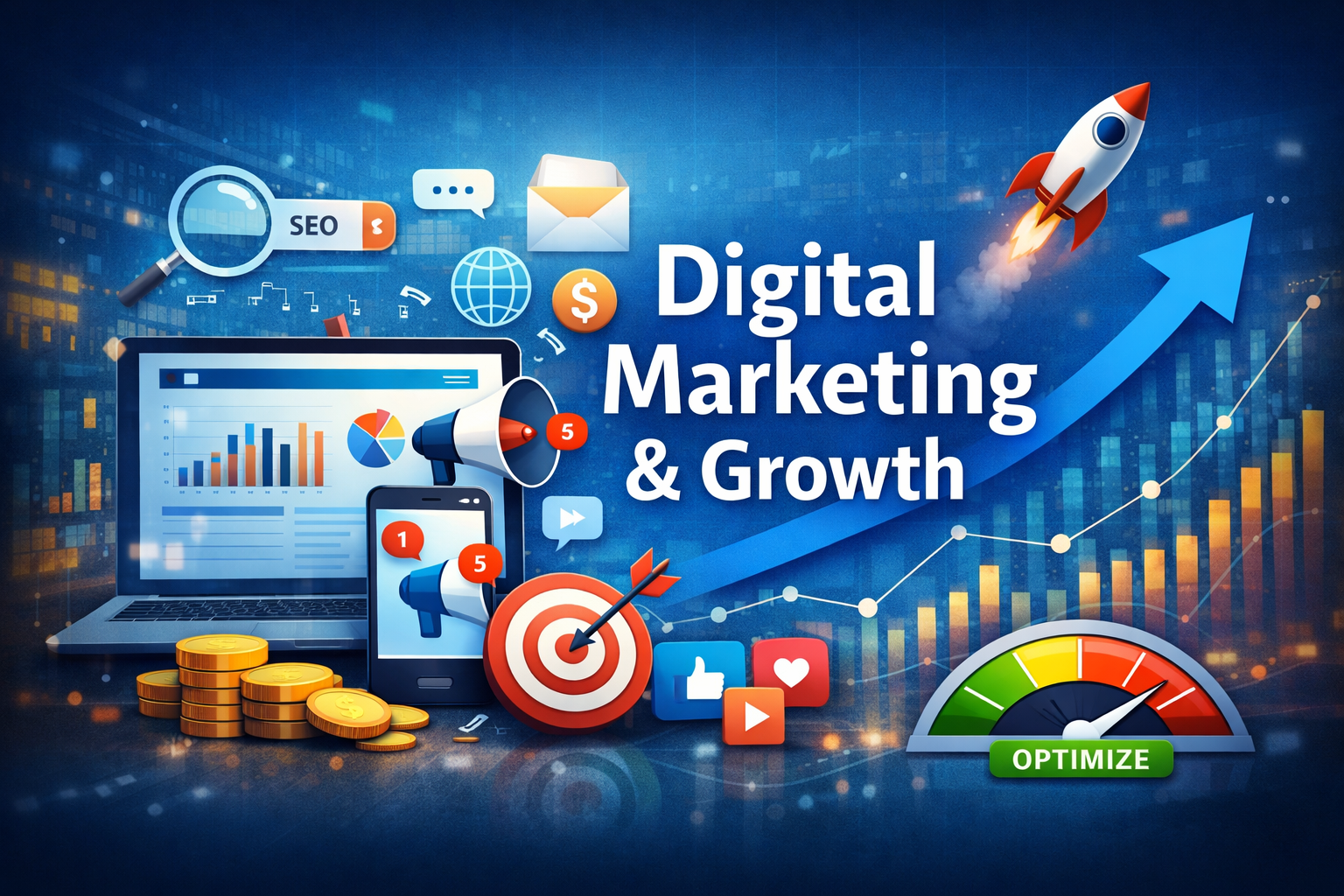 Digital Marketing & Growth is the alignment of strategy, channels, data, and execution to drive meaningful business outcomes. It focuses on: